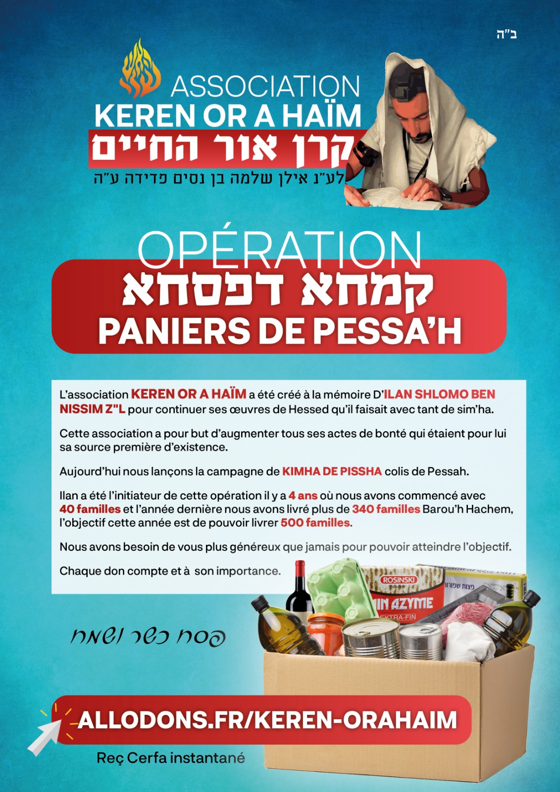 C'est pourquoi nous avons créé cette collecte de dons en mémoire d'Ilan Chlomo ben Nisim et en hommage à toutes les personnes qui ont perdu la vie lors des attaques en Israël. Notre objectif est de permettre à ces familles de passer les fêtes de Pessah avec dignité, en leur offrant des repas copieux et chaleureux.