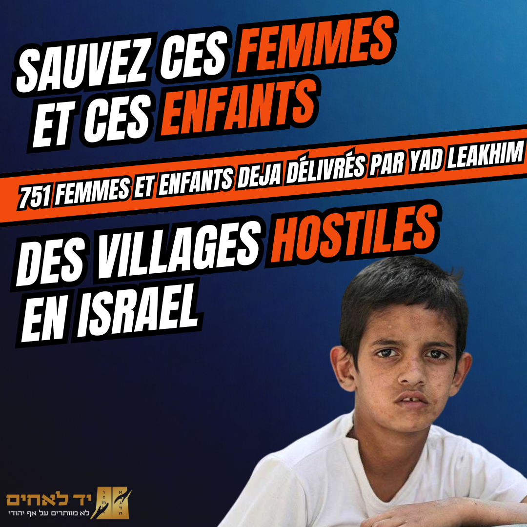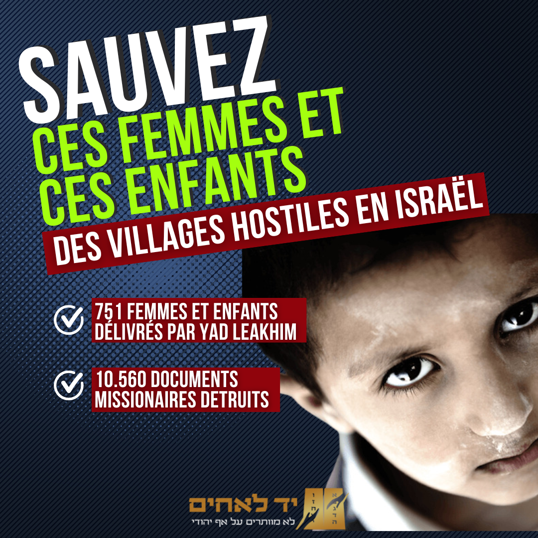 Yad Le'Achim mène une mission unique et sacrée : sauver les femmes et les enfants juifs enfermés dans des villages hostiles, où ils vivent sous une menace constante, isolés de leur famille et de leurs racines. Ces âmes courageuses, souvent piégées par des relations destructrices, endurent des conditions de vie d’une dureté inimaginable. Avec discrétion et dévouement, nos équipes se mobilisent pour leur offrir une issue, les arracher à ces environnements oppressants, et leur redonner une chance de vivre en sécurité.